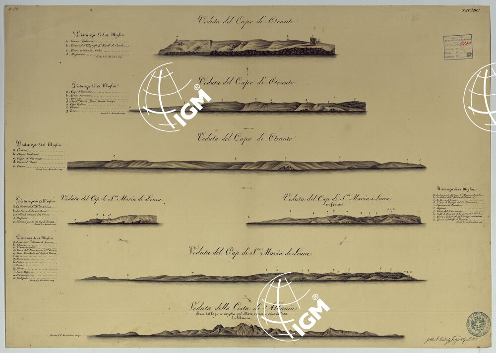 Docum. 75 -Tav. 53-1) Castello di Castro, Otranto, Capo di Leuca; Docum. 75 -Tav. 54-2) Monte Gargano, Saline e Costa di Barletta, Castello di Brindisi, Torre di Penne e Castello di Brindisi; Docum. 75 -Tav. 55-3) Capo di Otranto, Capo di S. Maria di Leuca, Costa d’Albania; Docum. 76 -Tav. 56-1) Capo di S. Maria di Leuca, Veduta della Costa tra Castro ed Otranto, Porto di Vadisco, Costa d’Albania; Docum. 76 -Tav. 57-2) Porto e Costa di Otranto, Porto di Brindisi e il Castello, Carovigno ed Ostuni; Docum. 76 -Tav. 58-3) Barletta, Monte Gargano. Le tavole di questo documento, come pure dei Docum. 78-1 e 78-2 – numero di Categorico 10113 e il Docum. 77 – numero di Categorico 10112 – si riconnettono ai lavori eseguiti dal 1817 al 1819 dagli ufficiali austriaci dell’Ist. Geografico di Milano per la Carta Idrografica dell’Adriatico e delle isole Ionie; il lavoro venne eseguito con il concorso dell’Officio Topografico di Napoli sotto la guida del Col. Visconti e del Cap. inglese W. Smyth. (Cfr. Firrao C., “Sull’Officio Topografico di Napoli, Origini e vicende, 1868”.