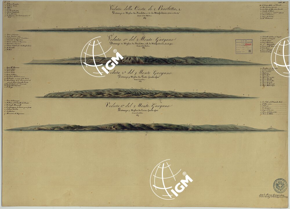 Docum. 75 -Tav. 53-1) Castello di Castro, Otranto, Capo di Leuca; Docum. 75 -Tav. 54-2) Monte Gargano, Saline e Costa di Barletta, Castello di Brindisi, Torre di Penne e Castello di Brindisi; Docum. 75 -Tav. 55-3) Capo di Otranto, Capo di S. Maria di Leuca, Costa d’Albania; Docum. 76 -Tav. 56-1) Capo di S. Maria di Leuca, Veduta della Costa tra Castro ed Otranto, Porto di Vadisco, Costa d’Albania; Docum. 76 -Tav. 57-2) Porto e Costa di Otranto, Porto di Brindisi e il Castello, Carovigno ed Ostuni; Docum. 76 -Tav. 58-3) Barletta, Monte Gargano. Le tavole di questo documento, come pure dei Docum. 78-1 e 78-2 – numero di Categorico 10113 e il Docum. 77 – numero di Categorico 10112 – si riconnettono ai lavori eseguiti dal 1817 al 1819 dagli ufficiali austriaci dell’Ist. Geografico di Milano per la Carta Idrografica dell’Adriatico e delle isole Ionie; il lavoro venne eseguito con il concorso dell’Officio Topografico di Napoli sotto la guida del Col. Visconti e del Cap. inglese W. Smyth. (Cfr. Firrao C., “Sull’Officio Topografico di Napoli, Origini e vicende, 1868”.
