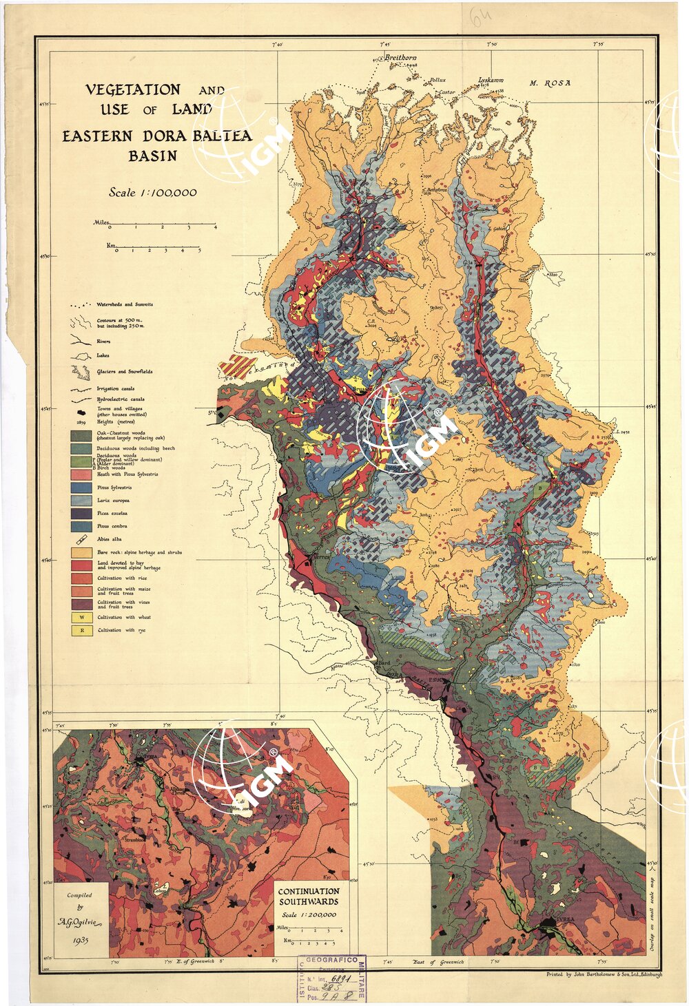 Rappresentazione orografica a curve di livello. Sotto il titolo recasi la legenda. In basso a sinistra è presente il continuo della carta alla scala 1:200.000. A. G. Ogilvie. Printed by John Bartholomew & Son, Ltd., Edinburgh.