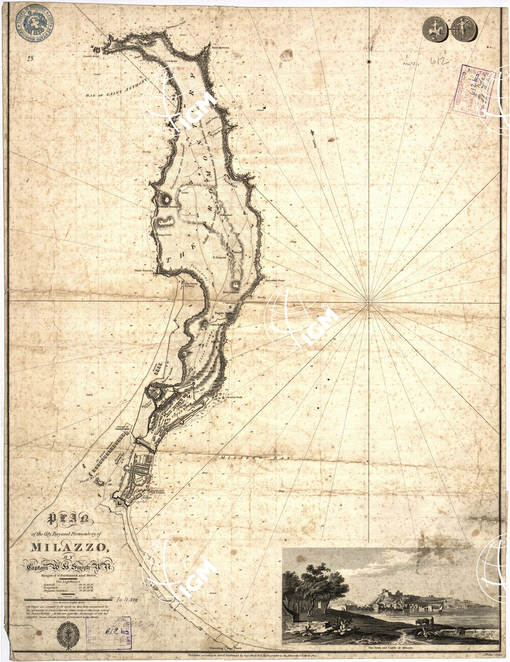 Cfr. anche le carte analoghe del Cap. Smyth corrispondenti ai numeri di files: A0002734 “Plan of the city, environs and anchorage of Girgenti…” e File B0005413 “Plan of the faro, or strait of Messina…”
