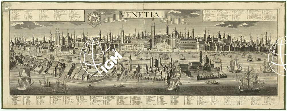 Epoca fine secolo XVIII.Dimensioni cm 31x 100. Prospetto di Milano. ” F. B. Werner delin. ; Joh Fried Probst excud. Aug. Vind “. In basso un elenco numerico dei principali edifici. Incisione su rame. Foglio unico montato su tela. Fa parte di un gruppo di sette carte dello stesso A. e dello stesso incisore.