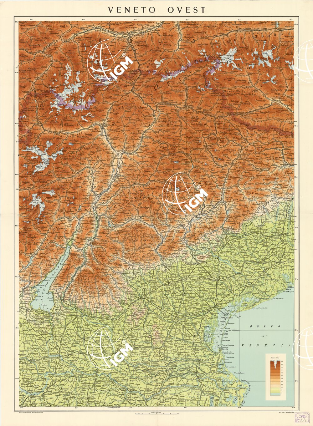 Rappresentazione orografica a tinte ipsometriche. In basso a destra è presente la legenda delle tinte ipsometriche. I.G.M. (FI).
