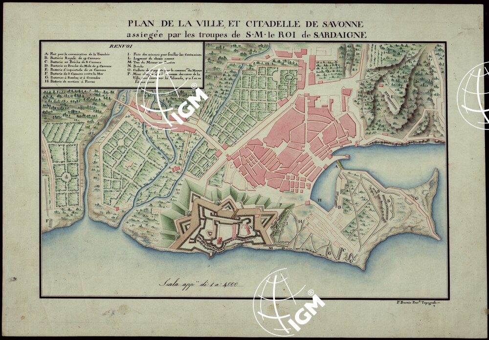 | Titolo proprio | PLAN DE LA VILLE, ET CITADELLE DE SAVONNE ASSIGEE PAR LES TROUPES DE S.M. LE ROI DE SARDAIGNE. |