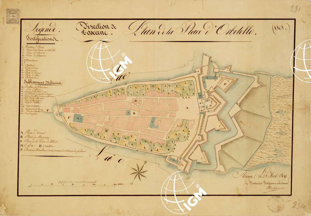 Disegno originale ad acquerello firmato " Le Directeur des Fortifications en Toscane, Morlaincourt, Florence Le 25 Avril 1809 ". In alto a destra la data 1808. A sinistra l'elenco numerico delle fortificazioni e costruzioni militari. Scala grafica in metri. Orientazione: nord spostato a destra.