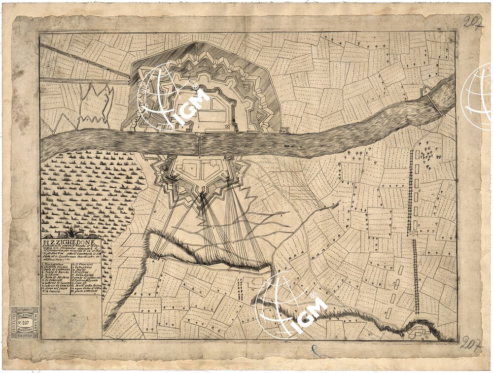 PIZZIGHEDONE ASSEDIATO DALLA ARMATA DI FRANCIA E DI SARDEGNA LI 10 NOVEMBRE ATTACCATO E LI 6 ALLA GHIERA PRESA PER ACCOR….LI 12 ET PIZZIGHEDONE LI 30. SOTTO IL COMANDO DI S. M. ET S. ECCELLENZA MARCHIALLO DE WILLARS ANNO 1733.