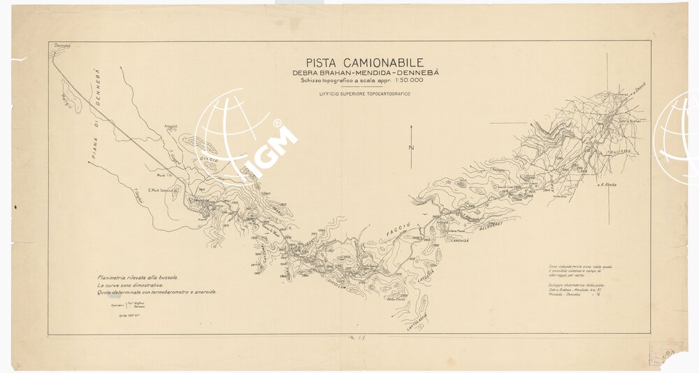 Planimetria rilevata alla bussola. Le curve sono dimostrative. Quote derivate con Termo barometro e aneroide. Operatori Ten. Grifoni, Barozzi. Sono indicate le zone nelle quali è possibile sistemare le zone di atterraggio degli aerei. Sviluppo chilometrico delòla pista. Schizzo topografico. 4 copie di cui 2 su tela.