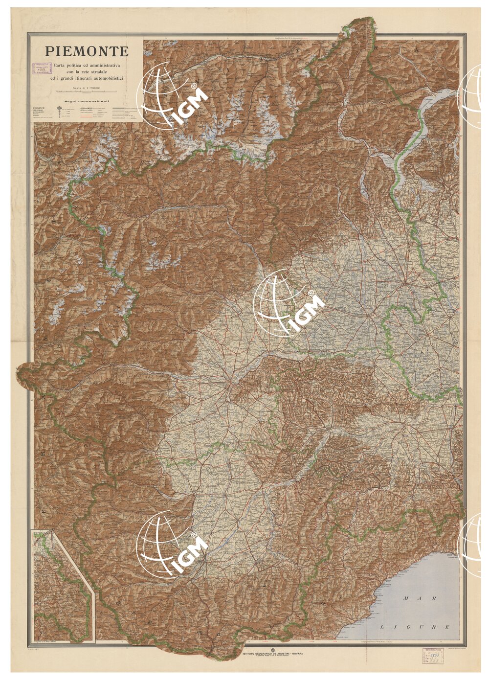 Grande carta a colori tratta dai tipi dell’I.G.M.. Mostra l’orografia a mezzo di curve di livello (equidistanza 100 m.) e sfumo in bistro, acque in azzurro, itinerari automobilistici e itinerari principali in rosso, ferrovie (a doppio binario, semplici, a scartamento ridotto), tranvie, strade (rotabili di larghezza sup. a 6 m., di larghezza inferiore a 6m., strade su fondo naturale, mulattiere, sentieri), confini politici e amministrativi in nero. Gli abitati, pure in nero, sono distinti in base al numero degli abitanti.
