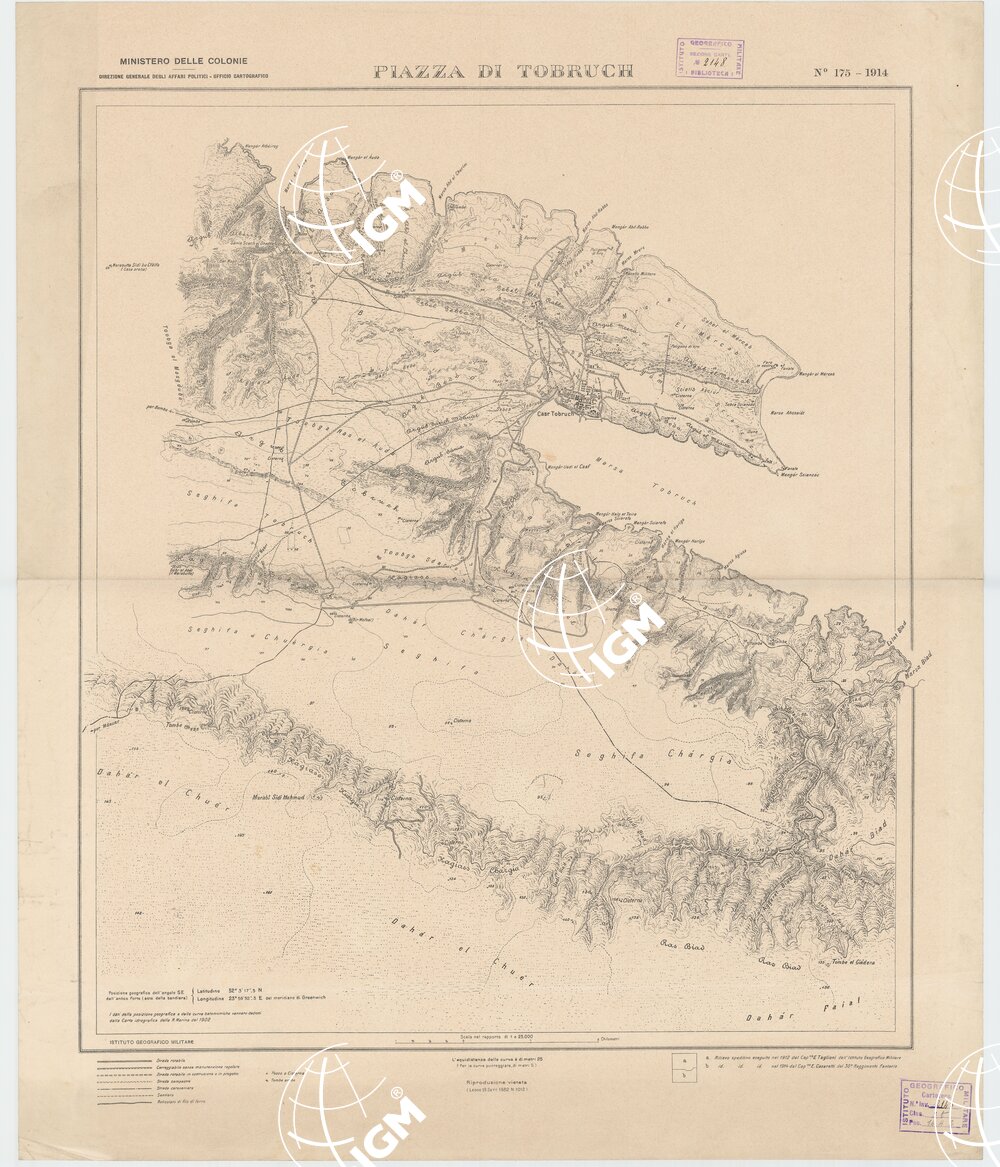 Un foglio stampato in nero con orografia a curve di livello tracciate all’equidistanza di 25 m. e curve punteggiate ogni 5 m. È poggiato su rilievi del Cap. Taglioni dell’I.G.M. (1912) e del Cap. Casaretti del 30° Fanteria (1914). I dati dalla posizione geografica e delle curve batometriche vennero dedotti dalla Carta Idrografica della R. Marina del 1902. La carta mostra strade rotabili, carreggiabili senza manutenzione regolare, strade rotabili in costruzione o in progetto, strade campestri, carovaniere, sentieri, reticolati di filo di ferro, pozzi o cisterne, tombe arabe. A sinistra, in basso, trovasi la leggenda dei segni convenzionali, a destra l’indicazione delle fonti utilizzate per la compilazione del foglio.