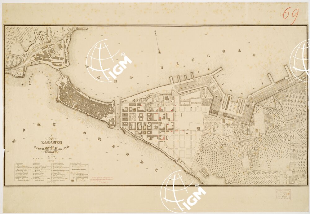 Rappresentazione orografica planimetrica. In basso a sinistra trovasi la leggenda. Accanto alla leggenda vi è scritto a penna: “Le fabbriche tratteggiate in rosso sono quelle costruite dalla data del presente piano a tutt’oggi. 22 luglio 1891”.