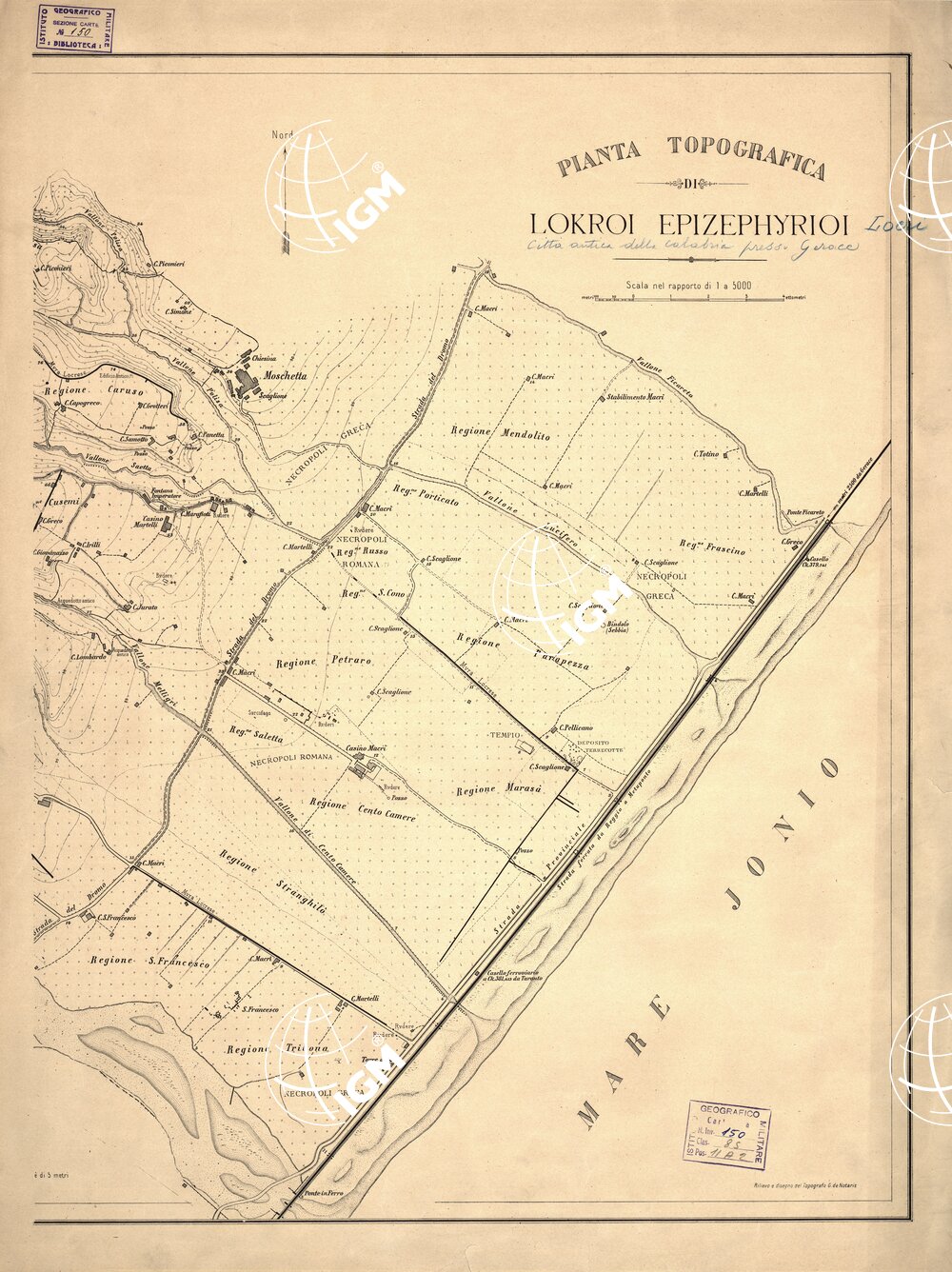 Carta in due fogli stampati in nero con orografia dimostrata a mezzo di curve di livello tracciate alla equidistanza di metri 5. Essa indica le varie necropoli greche e romane, i ruderi e i resti dell’antica città calabra presso Gerace. Rilievo e disegno furono eseguiti dal Topografo G. de Notaris.