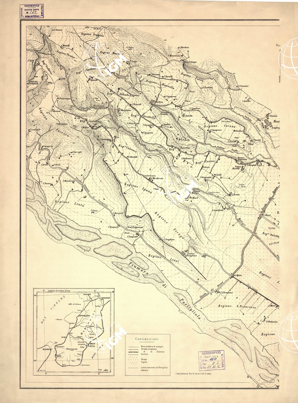 Carta in due fogli stampati in nero con orografia dimostrata a mezzo di curve di livello tracciate alla equidistanza di metri 5. Essa indica le varie necropoli greche e romane, i ruderi e i resti dell’antica città calabra presso Gerace. Rilievo e disegno furono eseguiti dal Topografo G. de Notaris.