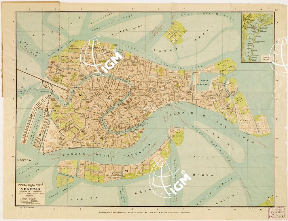 Rappresentazione orografica planimetrica. Sotto al titolo le spiegazioni; in alto a destra un riquadro nel quale è rappresentata la Laguna Veneta. Edizione Grafica della Libreria Cartoleria Giovanni Zanetti, Venezia.