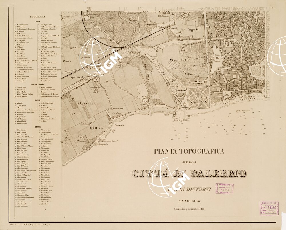 Carta tratta da nitida incisione su rame, stampata in nero, in quattro fogli, ognuno delle dimensioni di m. 0,48×0,61, pubblicata dall’Officio Superiore dello Stato Maggiore, Sez. di Napoli, alla scala di 1:5.000. Sono distinte le varie colture. Ciascun foglio reca un elenco numerico delle principali costruzioni, strade e piazze. La scala grafica è calcolata in miglia geografiche, passi geodetici, chilometri e metri. Gli scandagli sono calcolati in metri.
