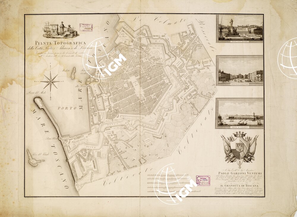 Bella pianta rilevata e disegnata da Carlo Ristori, incisa su rame da Antonio Verico, scritta nello studio Giarrè. Dedicata a S. E. Paolo Garzoni Venturi. Stampa in nero. A destra alcune vedute delle città. Scale grafiche in metri, palmi romani, braccia fiorentine, tese francesi, piedi inglesi.