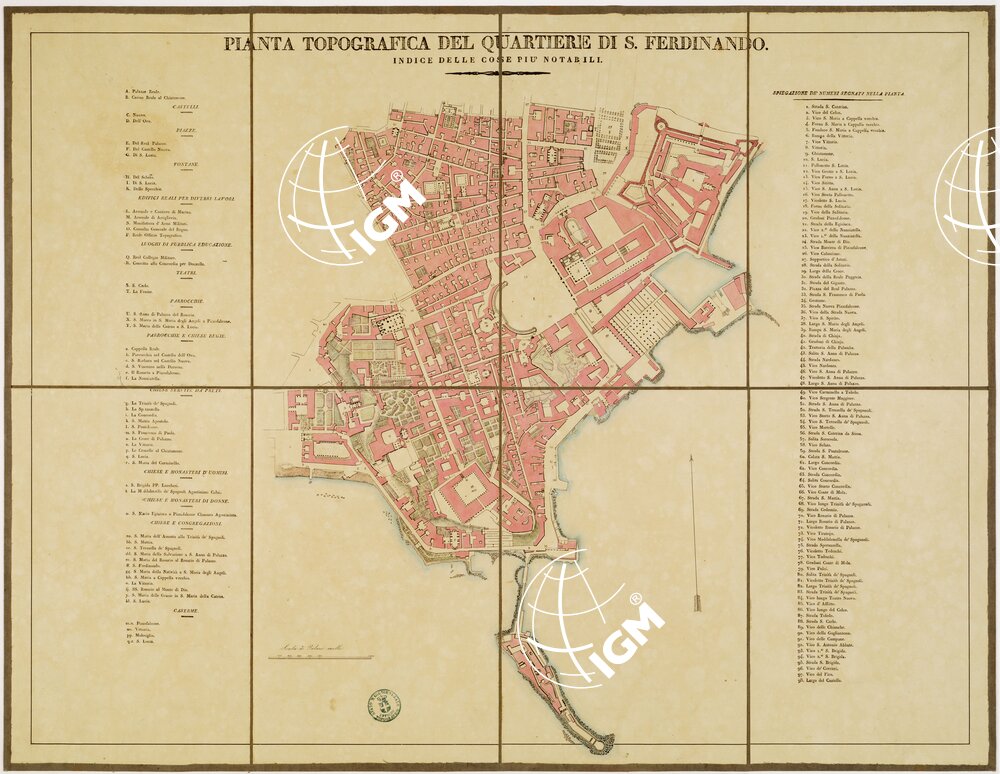 Senza data. Epoca metà XIX secolo. Scala 1:33.000 circa. Dimensioni m. 0,56×0,73. Sono dodici fogli montati su tela a stacchi disegnati a colori, ognuno contenente la pianta di un quartiere accompagnata da un elenco numerico e alfabetico degli edifici, porte, piazze, vie, ecc. Le costruzioni sono colorate in rosso, le acque in azzurro, le colture in verde. L'orografia è dimostrata col tratteggio. Scala grafica in palmi. E' lavoro attribuito all' Officio Topografico di Napoli.
