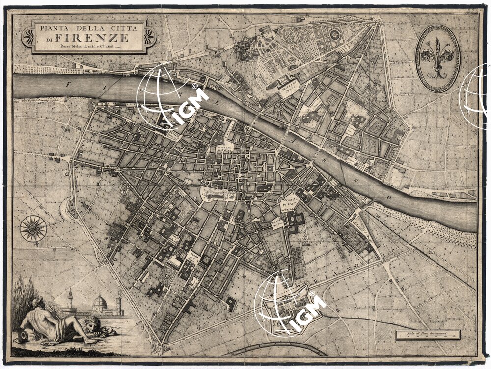 | Note foto | Epoca 1808. Scala 1:5.400. Dimensioni m. 50×67. Incisione su rame in foglio unico, montato su tela. E' orientata col nord invertito al basso. Scala grafica in Passi fiorentini. |