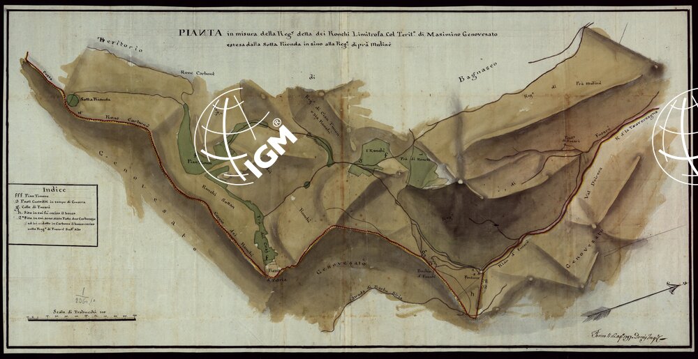 | Titolo proprio | PIANTA IN MISURA DELLA REG.E DETTA DEI RONCHI LIMITROFA COL TERIT.O DI MASIMINO GENOVESATO ESTESA DALLA SOTTO RIONDA IN SINO ALLA REG.E DI PRA' MOLINE. |