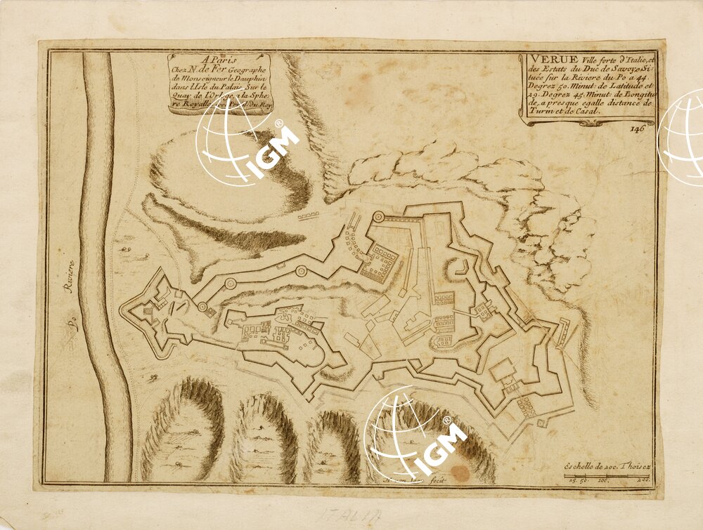 …SITUEE SUR LA RIVIERE DU PO A 44 DEGREZ 50 MINUT: DE LATITUDE ET 29 DEGREZ 45 MINUT: DE LONGITUDE, A PRESQUE EGALLE DISTANCE DE TURIN ET DE CASAL. A PARIS CHEZ N. DE FER GEOGRAPHE DE MONSEIGNEUR LE DAUPHIN DANS L’ISLE DU PALAIS, SUR LE QUAY DE L’ORLOGE A LA SPHERE ROYALLE AVEC PRIVIL. DU ROY.