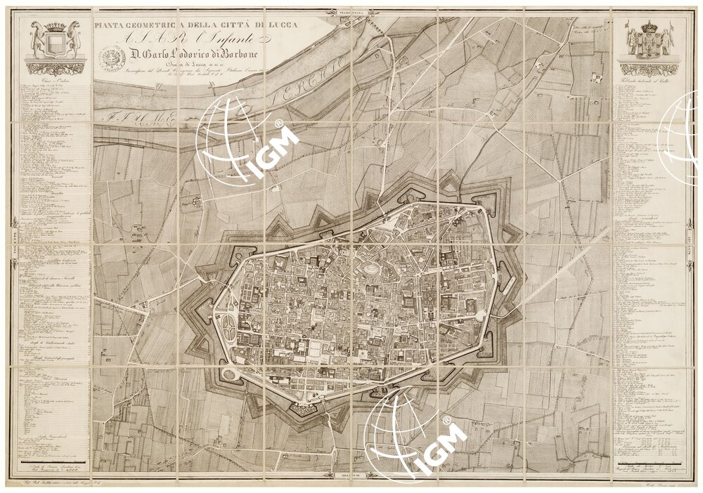 PIANTA GEOMETRICA DELLA CITTA' DI LUCCA A.S.A.R. L' INFANTE D. CARLO LODOVICO DI BORBONE DUCA DI LUCCA, ecc. IN OCCASIONE DEL QUINTO CONGRESSO DEI SAPIENTI ITALIANI L' ANNO 1843. IL PROF. PAOLO SINIBALDI O.D.C.