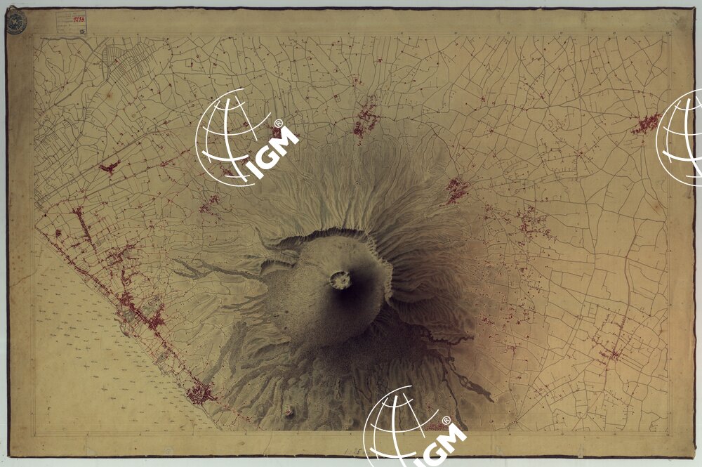 Un foglio disegnato ad acquerello a luce obliqua ed abitati in rosso. E’ supposto disegno originale del foglio corrispondente della carta di Napoli e dintorni al 25.000 in 15 fogli (vedi N° 34 d’ordine, Cart.d’Arch. N° 90, Docum. N° 14).