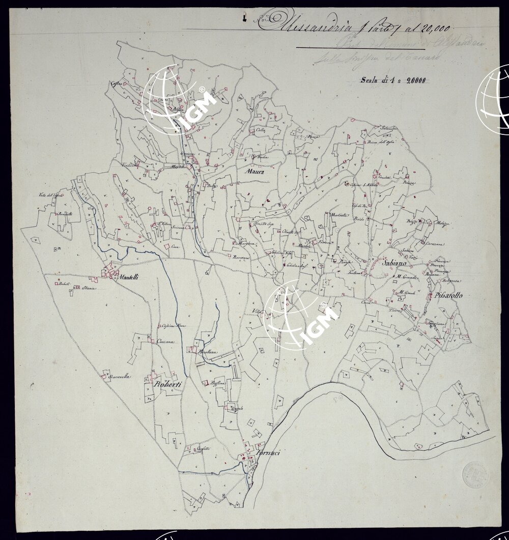 Il titolo non è presente sulla carta. Gruppo di 51 mappe catastali di diversi comuni, impiegate con tutta probabilità per la costruzione della carta generale degli Stati Sardi al 50.000. Senza firma, eccetto due, firmate da Lagrange, una riduzione del piano catastale del territorio d’ivrea firmato valsecchi 1822, e una riproduzione dei piani catastali di comuni della provincia d’Ivrea firmata Cap. Roggero.