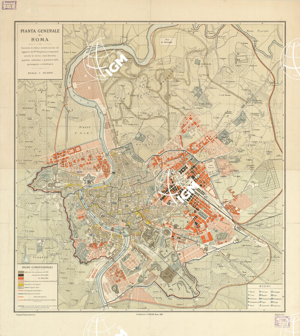 | Note foto | Rappresentazione orografica planimetrica. In basso a sinistra i segni convenzionali; in basso a destra la legenda dei rioni. R. Stab. Cart. Virano, Roma. |