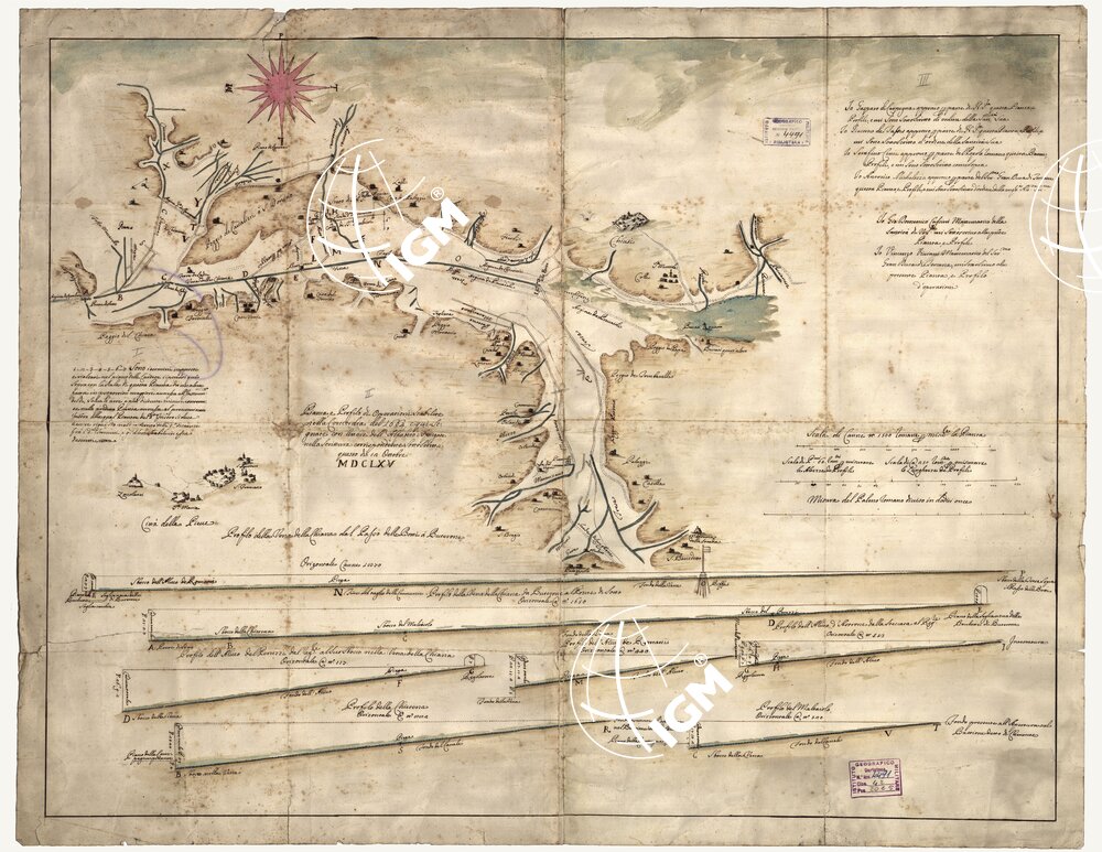 Pianta manoscritta,acquerellata a mano. Una nota riporta l’approvazione da parte dei delegati Gasparo di Carpegna,Giacomo de Tessis,Serafino Cenci e Antonio Michelozzi,della pianta e profili presenti nel documento. Segue l’approvazione di pianta e profili anche da parte dei matematici Gio. Domenico Cassini (sovrintendente dello stato della Chiesa) e Vincenzo Viviani (matematico del granduca di Toscana). Vediamo rappresentato il corso del fiume Chiana,nel tratto compreso tra Città della Pieve e Chiusi. In basso vari profili e altezze di tratti particolari. Scala grafica in canne Romane. Detta pianta si riferisce alla perizia condotta nel 1664 dai rappresentanti del Granducato di Toscana e lo stato Pontificio, per stabilire una convenzione sui terreni bonificati sui confini di detti stati. Vedasi anche “PIANTA E PROFILO DELLO STATO DELLE ACQUE DELLE CHIANE…”inventario 4478 e 4479.Cfr.CORSINI I.,”Ragionamento storico sopra la Val di Chiana”,1742 pag.52 e FOSSOMBRONI V., Memorie idraulico-storiche sopra la Val di Chiana, 1789, pag 178.
