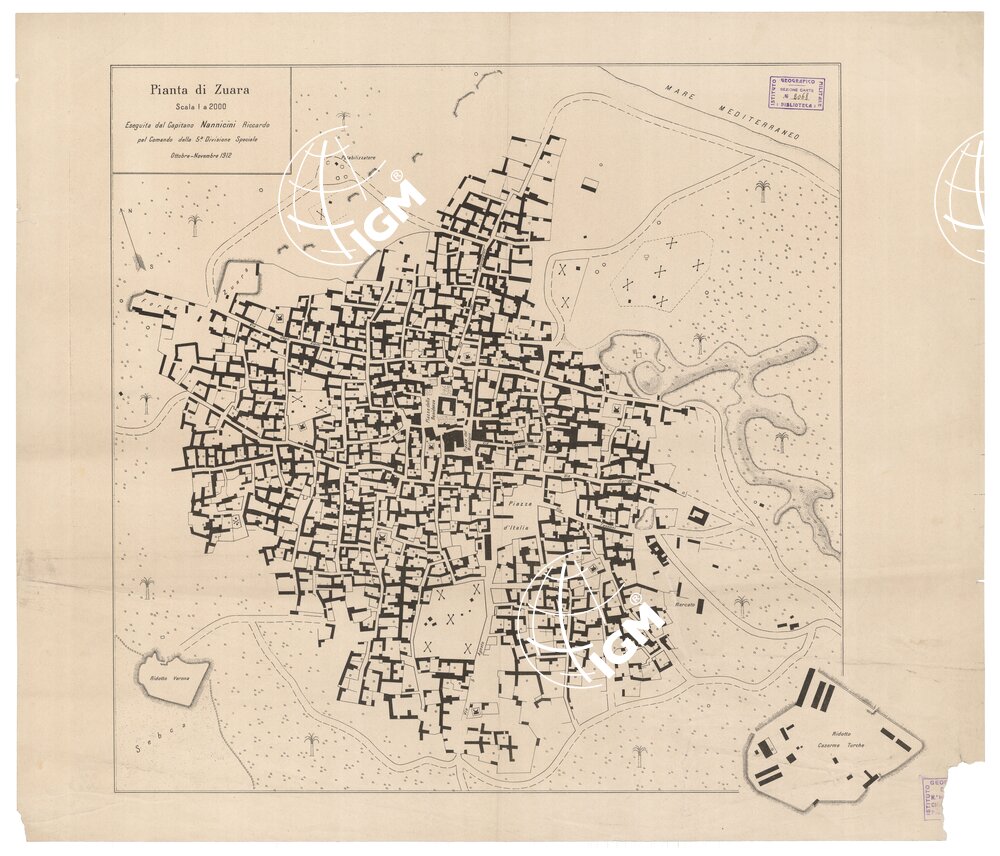 Eseguita dal Cap. R. Nannicini per il Comando della 5^ Divisione Speciale. Stampa in nero. Rappresenta uno dei lavori parziali affidati ad ufficiali dell’I.G.M. messi a disposizione del Comando del Corpo di operazioni durante l’occupazione militare.