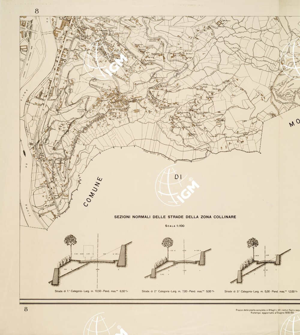 COLL´INDICAZIONE DEI DUE PIANI REGOLATORI E DI AMPLIAMENTO RISPETTIVAMENTE DELLA ZONA PIANA (VIGENTE PER LEGGE 5 APRILE 1908 E R. DECRETO 15 GENNAIO 1920) E DELLA ZONA COLLINARE (VIGENTE PER DECRETO LUOG. 10 MARZO 1918) AGGIORNATI COLLE VARIANTI DELIBERATE SUCCESSIVAMENTE SINO A GIUGNO 1935 – XIII. COMPILATA DAL SERVIZIO TECNICO MUNICIPALE DEI LAVORI PUBBLICI.