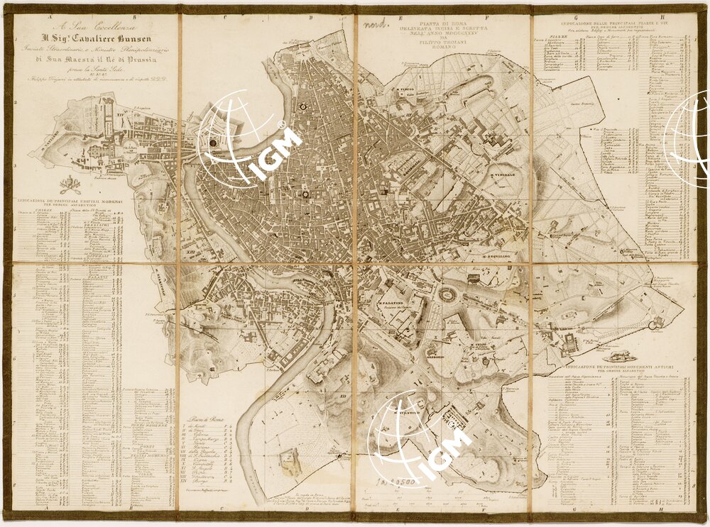 Cartina incisa su rame. Foglio unico montato su tela a stacchi. Rilievo orografico rappresentato con fine tratteggio. E’ sussidiata da elenco numerico delle principali costruzioni, vie, piazze e monumenti antichi. E’ dedicata al Cav. Bunsen inviato straordinario e Ministro Plenipotenziario di S.M. il Re di Prussia presso la Santa Sede.