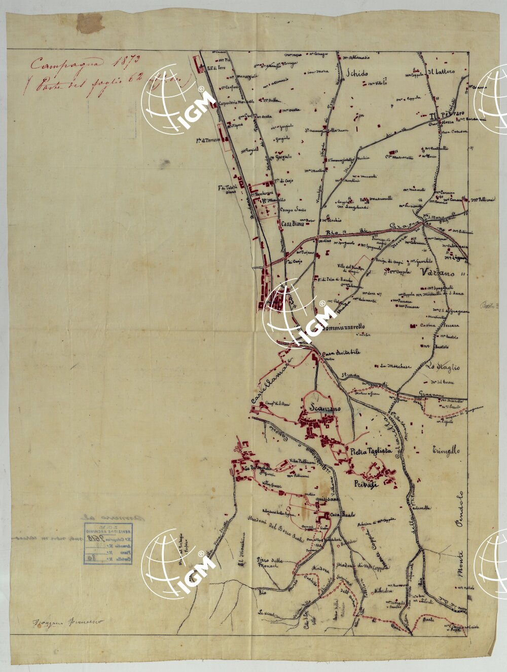 Elementi originali che hanno servito per la formazione delle tavolette della CARTA TOPOGRAFICA DEL MONTE VESUVIO RILEVATA E DISEGNATA DAGLI ALLIEVI DELL’IST. TOPOGRAFICO MILITARE NEGLI ANNI 1875-76 ALLA SCALA DI 1:10.000 archiviata in questo stesso documento (n° d’Ordine 65 – Cart. d’Arch. 80 – Docum. 9618.