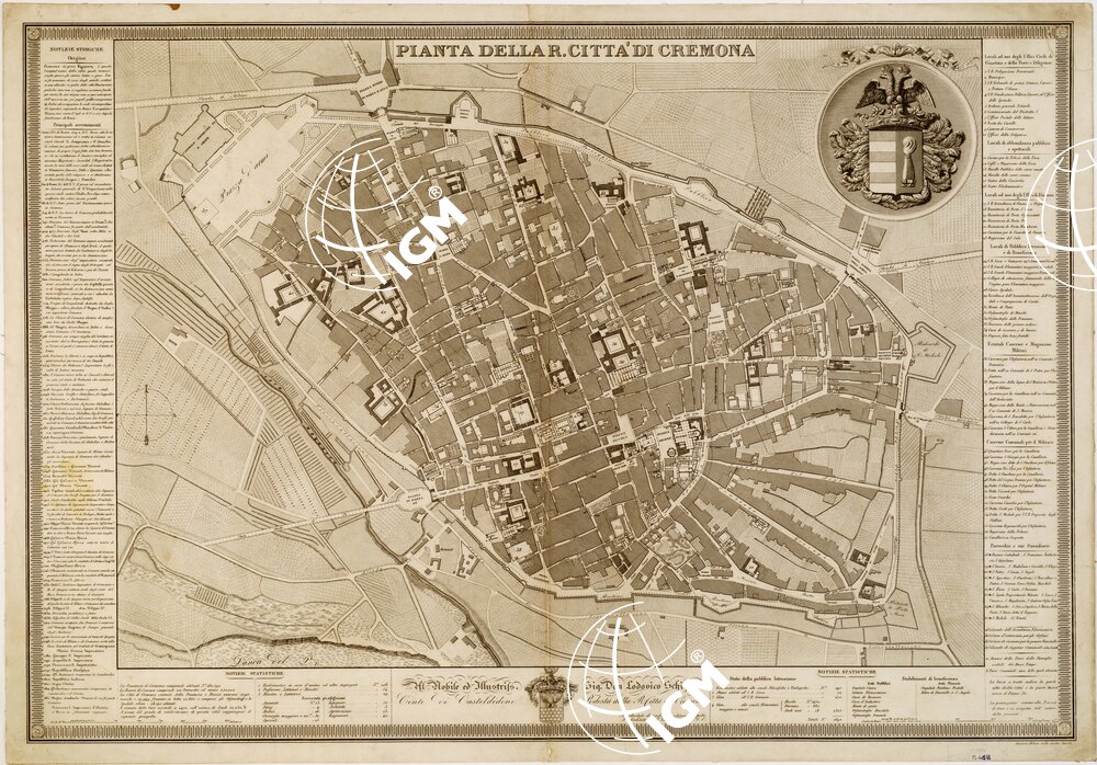 Rappresentazione orografica planimetrica. In basso la dedica “Al Nobile ed illustr. Sig. Don Lodovico Schizzi, Conte di Casteldidone, Podesta’ della R. Città di Cremona”, firmata dall’Architetto Prof. Luigi Voghera. La pianta fu incisa a Milano nello studio Stucchi. E’ sussidiata da elenco numerico degli edifici principali, notizie storiche e statistiche. Scale grafiche in braccia milanesi e in metri.