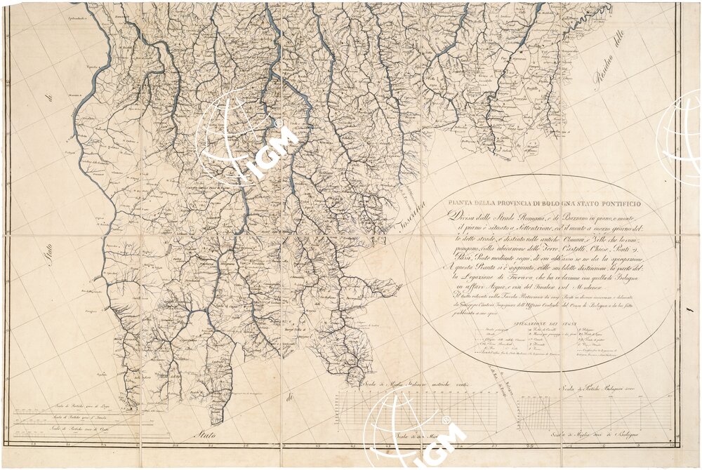 PIANTA DELLA PROVINCIA DI BOLOGNA STATO PONTIFICIO DIVISA DALLE STRADE ROMANA E DI BAZZANO IN PIANO, IN MONTE, ECC., (s. d.).- Foglio Sud
