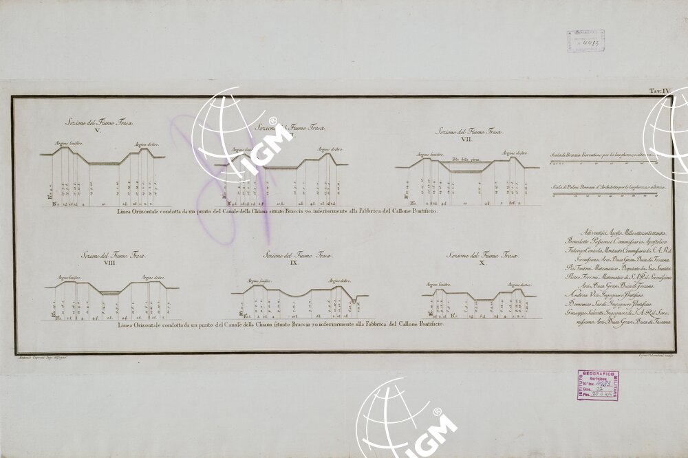 Pianta della Val di Chiana eseguita in seguito alla perizia composta di Benedetto Passionei, Pio Fantoni matematico, Andrea Vici ingegnere e Domenico Sardi ingegnere, delegati dello Stato Pontificio e il Conte Federico da Montauto, Pietro Ferroni e GiuseppeSalvetti ingegnere, commissari del Gran Duca di Toscana. Incisione su rame. Scala grafica in canne fiorentine e in canne romane. Annesse n. 7 tavole delle stesse dimensioni con vari profili a scale varie disegnate da Capretti A. e da Giu. Bald. Puliti, incise da C. Colombini B. Eredi, Gio. Batta Cecchi e G. Vascellini.