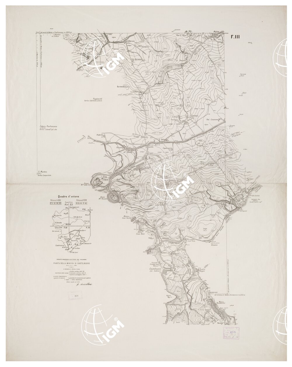 Otto fogli stampati in nero con orografia a curve di livello tracciate alle equidistanze di 5, 1 e 0,20 m. nei fogli n. 5 – 6 – 7 – 8, che sono alla scala di 1:20.000 e di 25,5 e 1 m., nei fogli I, II, III, IV, che sono alla scala di 1:4.000. L’altimetria è riferita al mare. Autore G. Crivellari.. L’altimetria è riferita al mare. Autore G. Crivellari.