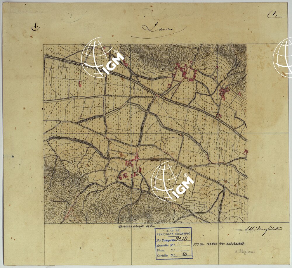 Elementi originali in 42 spezzoni che hanno servito per la formazione delle tavolette della CARTA TOPOGRAFICA DEL MONTE VESUVIO RILEVATA E DISEGNATA DAGLI ALLIEVI DELL’IST. TOPOGRAFICO MILITARE NEGLI ANNI 1875-76 ALLA SCALA DI 1:10.000 archiviata in questo stesso documento (n° d’Ordine 65 – Cart. d’Arch. 80 – Docum. 9618 ).