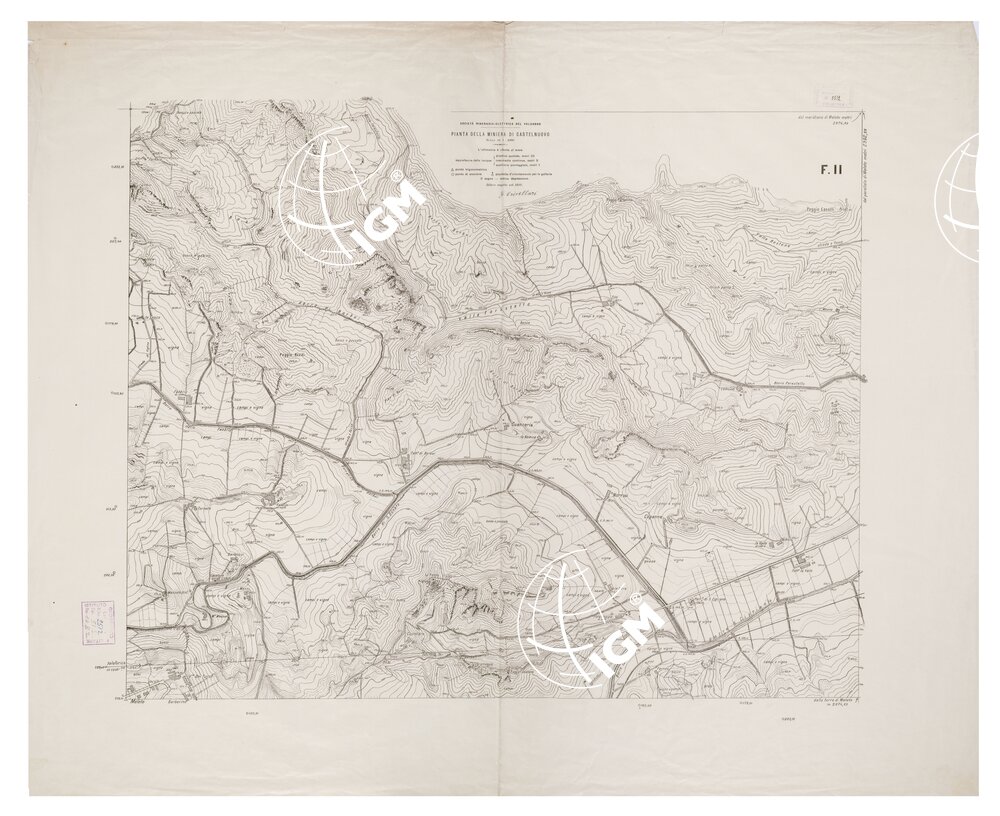 Otto fogli stampati in nero con orografia a curve di livello tracciate alle equidistanze di 5, 1 e 0,20 m. nei fogli n. 5 – 6 – 7 – 8, che sono alla scala di 1:20.000 e di 25,5 e 1 m., nei fogli I, II, III, IV, che sono alla scala di 1:4.000. L’altimetria è riferita al mare. Autore G. Crivellari.