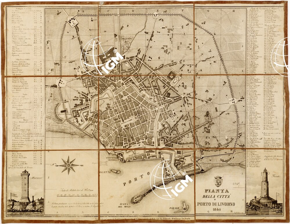 Incisione su rame in foglio unico montata su tela a stacchi. Incisore Carlo Verice. La pianta è orientata col nord spostato a sinistra. E’ sussidiata di elenco numerico delle principali costruzioni.