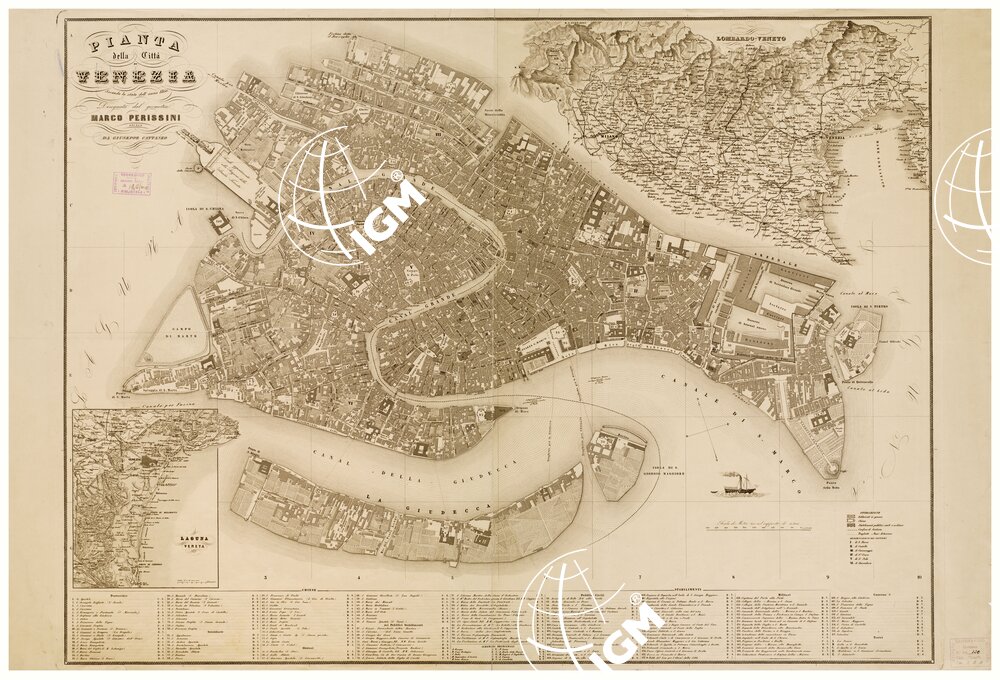 La stessa carta al numero d’inventario 120 che ha come didascalia: “un foglio tratto da incisione su rame montato su tela a stacchi stampato in nero per le costruzioni civili e militari, rosso per gli edifici religiosi, azzurro per le acque. Sono indicati giardini, orti, confini di sestieri, traghetti, pozzi artesiani, ecc. In alto a destra una cartina parziale del Lombardo-Veneto: in basso a sinistra una cartina della Laguna Veneta. La carta è sussidiata di elenco alfabetico numerico delle principali costruzioni religiose, civili e militari”.