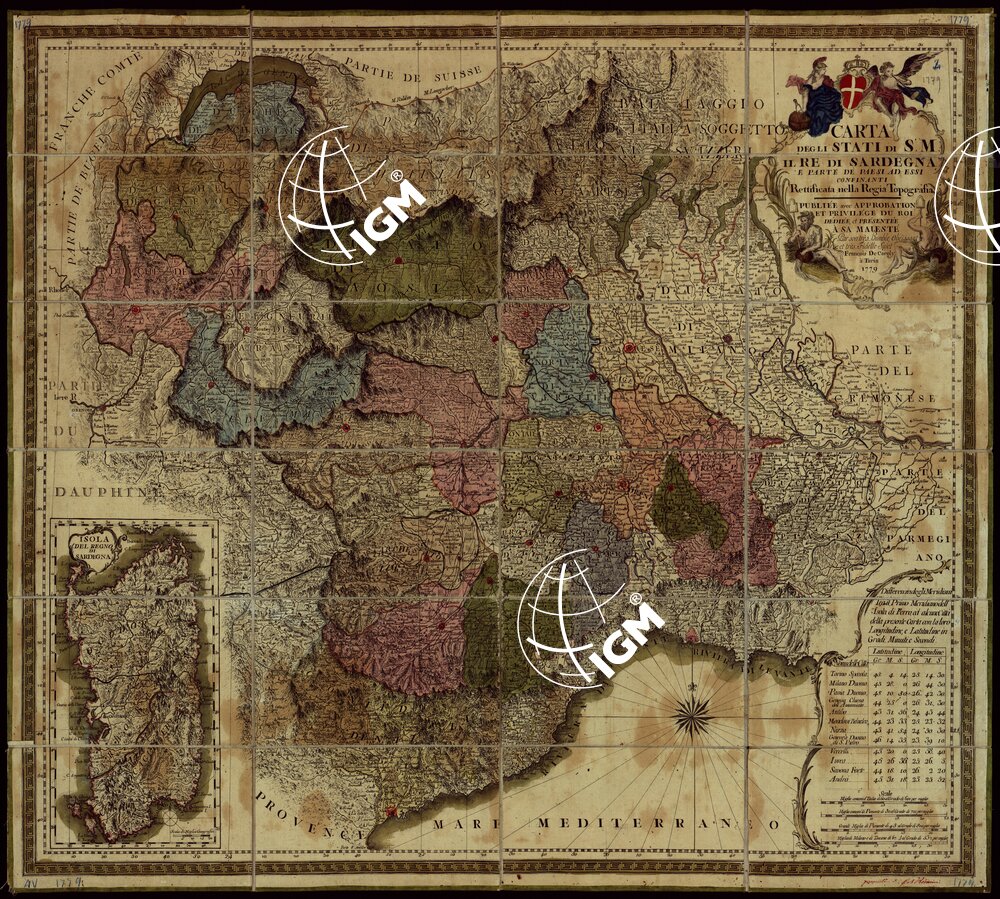 Un foglio montato su tela a stacchi e ripiegato in una custodia riportante la scritta ” Carte des etats du Roi” par de Caroly. Orografia semi prospettica a tratteggio. Abitati principali rappresentati schematicamente in pianta e riempiti in rosso. Idrografia a rete stradale in nero. Territori e confini politici ed amministartivi a colori. A sinistra in un riquadro all’interno del foglio una cartina dell’Isola di Sardegna. A destra in basso un prospetto delle “Differenze degli meridiani tra il primo meridiano dell’Isola del Ferro ed alcune città della presente carta con loro longitudine e latitudine in Gradi, Minuti e Secondi” Quattro scale grafiche in miglia d’Italia, miglia comuni e grandi miglia di Piemonte, e miglia di Milano e di Toscana.