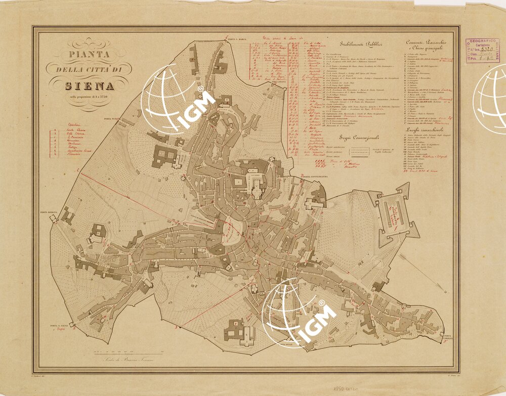 Incisione su rame. Rappresentazione orografica a tratteggio. In alto a destra vari elenchi: stabilimenti pubblici, conventi parrocchie e chiese principali, segni convenzionali e luoghi rimarchevoli. Scala grafica di braccia toscane. G. Tarducci disegnò, G. Pozzi incise. In basso a lapis la data: 1850 circa.