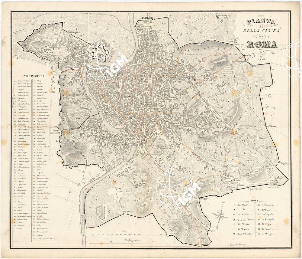 Incisione su pietra di Luigi Balatri. Orientazione: il nord è spostato a destra. Orografia rappresentata con trateggio. E’ sussidiata da elenco dei rioni ed elenco numerico delle principali costruzioni. Due scale grafiche in miglia italiane e in metri.