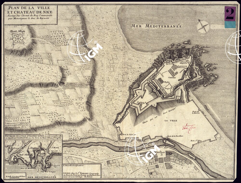 | Titolo proprio | PLAN DE LA VILLE ET CHATEAU DE NICE ASSIEGE' PAR L'ARMEE DU ROY COMMANDEE PAR MONSEIGNEUR LE DUC DE BARWICK. |