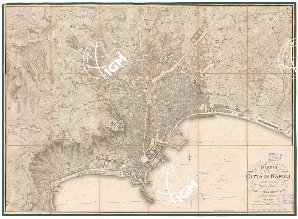 Epoca 1828. Scala 1:8.000. Un foglio tratto da incisione su rame stampato in nero, montato su tela a stacchi. L’ orografia è dimostrata col tratteggio. Gli scandagli sono calcolati in piedi parigini. La carta rappresenta il terreno compreso tra Fuorigrotta, Portici e Capodimonte. La copia al numero d’ inventario 1761 bis reca la data 1828-65. La copia al numero d’ inventario 1885 (Files B0006627) è datata 1828-73.