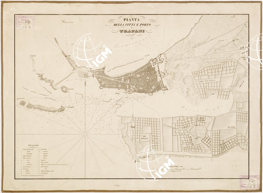 Epoca supposta metà del XIX secolo. Un foglio tratto da incisione su rame. Non vi appare nè da chi pubblicato, nè la data: esso tuttavia risulta ricordato dal Firrao (Sull’Officio Topografico di Napoli. Origini e Vicende, 1868), tra i lavori topografici eseguiti da quell’Officio sino al 1861. Stampa in nero. La pianta è sussidiata da un breve elenco numerico delle principali costruzioni. Rappresentazione orografica a tratteggio. Gli scandagli sono in piedi di Francia e riportati alla bassa marea e la scala grafica è calcolata in palmi.