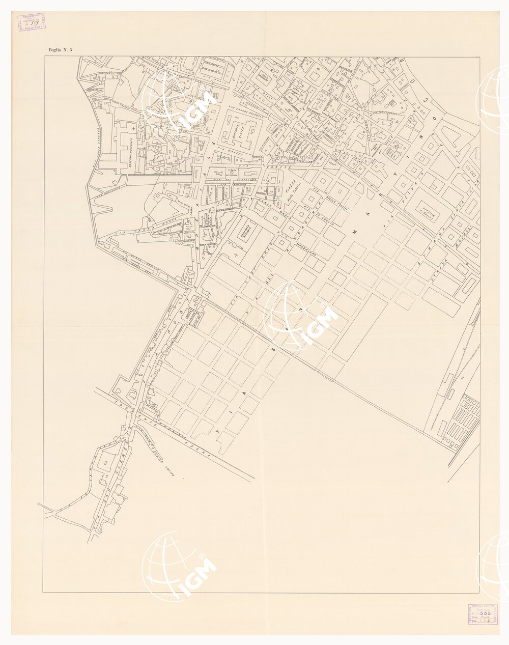 | Note foto | Scala 1:2.000. Dimensioni m.0,65×0,80 (margine riquadro) per foglio. Riproduzione in 6 fogli eseguita dall' I.G.M. di Firenze nel 1909 tratta da una copia cianografica di provenienza non precisata. |