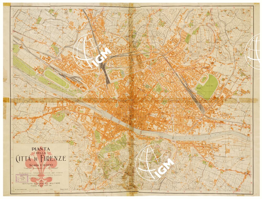 Riduzione fotomeccanica del rilievo aerofotogrammetrico del sistema Santoni alla scala di 1:5.000. Rappresentazione orografica a curve di livello. Sotto al titolo la legenda del trasporto pubblico. I.G.M. (FI).