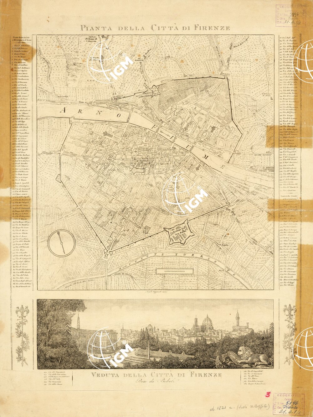 Incisione su rame. Rappresentazione orografica planimetrica. Ai lati della carta i “Nomi delle Strade a Mezzogiorno d’Arno”. In basso la “VEDUTA DELLA CITTA’ DI FIRENZE PRESE DA BOBOLI”. A. Coppiardi incise, G. Canacci disegnò.