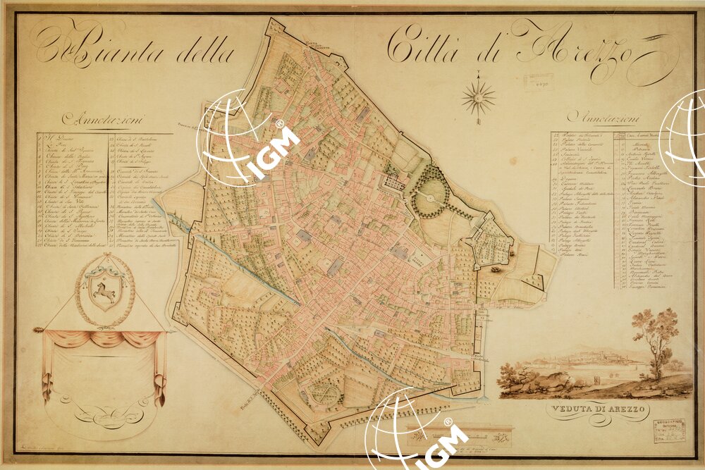 Pianta manoscritta acquerellata a colori, rosso per le costruzioni, verde per le coltivazioni, i giardini ecc., azzurro per le acque. Firmata Daniele Manzini. A destra e a sinistra elenco numerico delle principali costruzioni. In basso una veduta della città. Scala grafica in canne fiorentine. Un foglio montato su tela. Disegno originale che servì per la pianta seguente.
