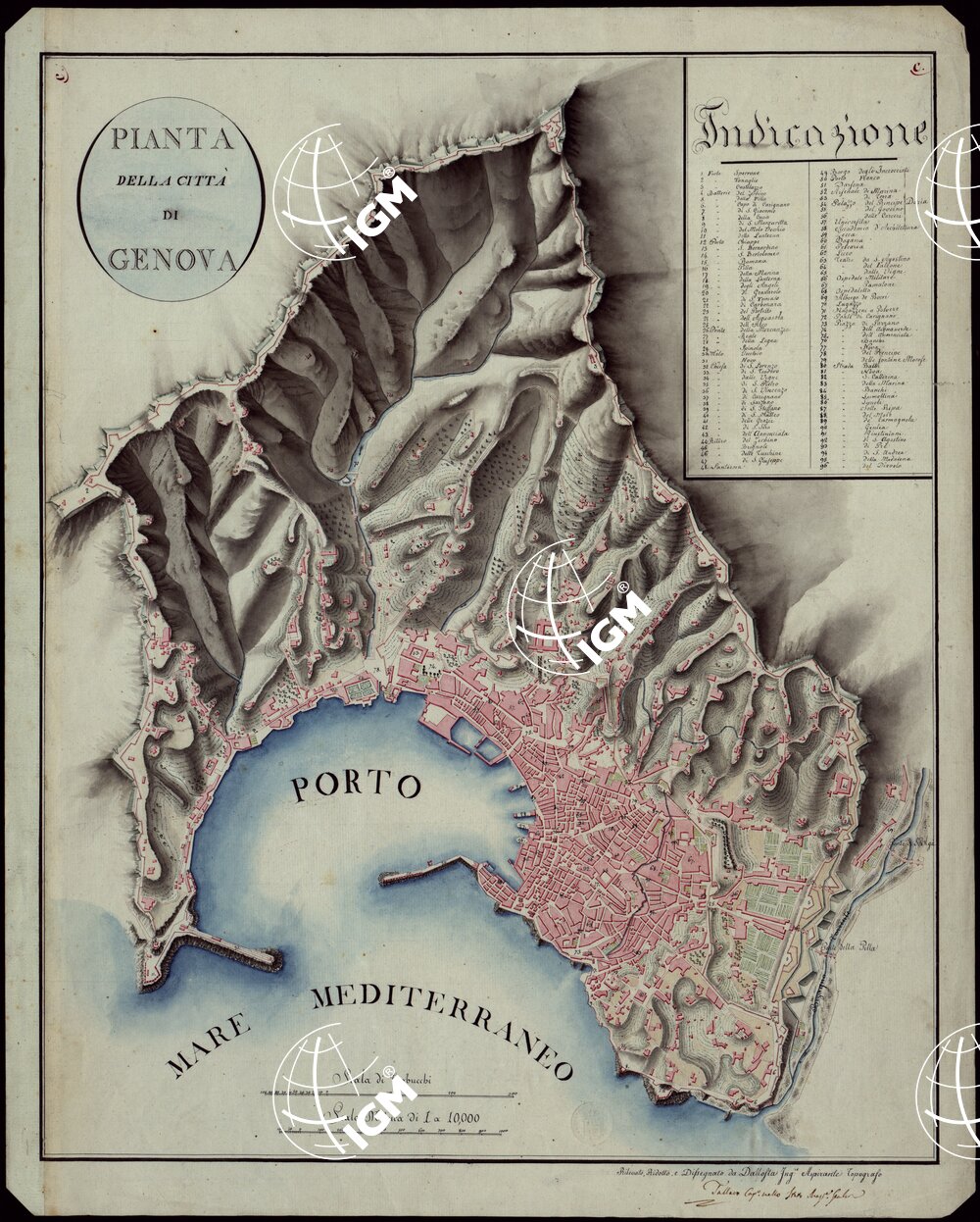 Carta acquerellata, la luce obliqua evidenzia i rilievi, rilevata ridotta e disegnata da Dallosta Ing. aspirante topografo, vistata dal Cap. Tallaro. Costruzioni in rosso, coltivazioni in verde. In alto a destra elenco numerico delle principali costruzioni. Epoca presunta a prima del 1849.
